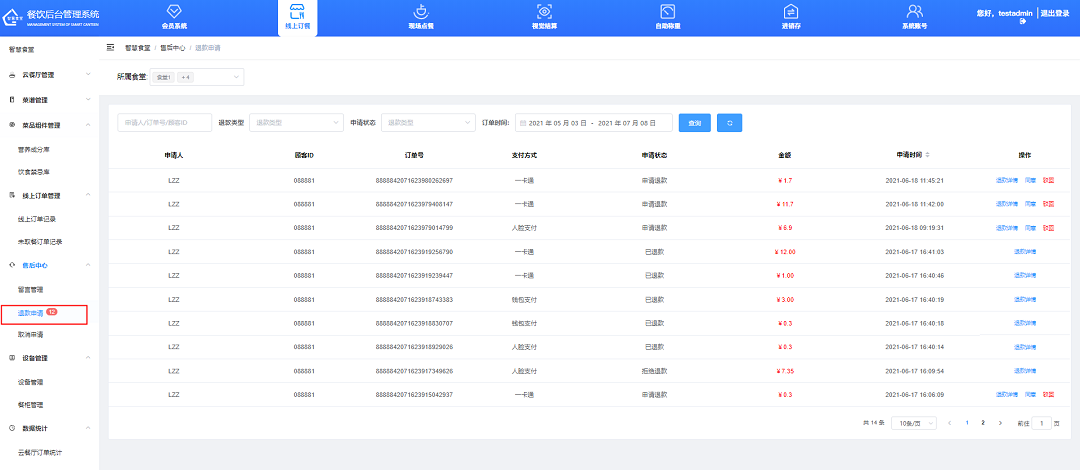 ①輸入申請人、訂單號、退款類型、訂單時間等信息。
