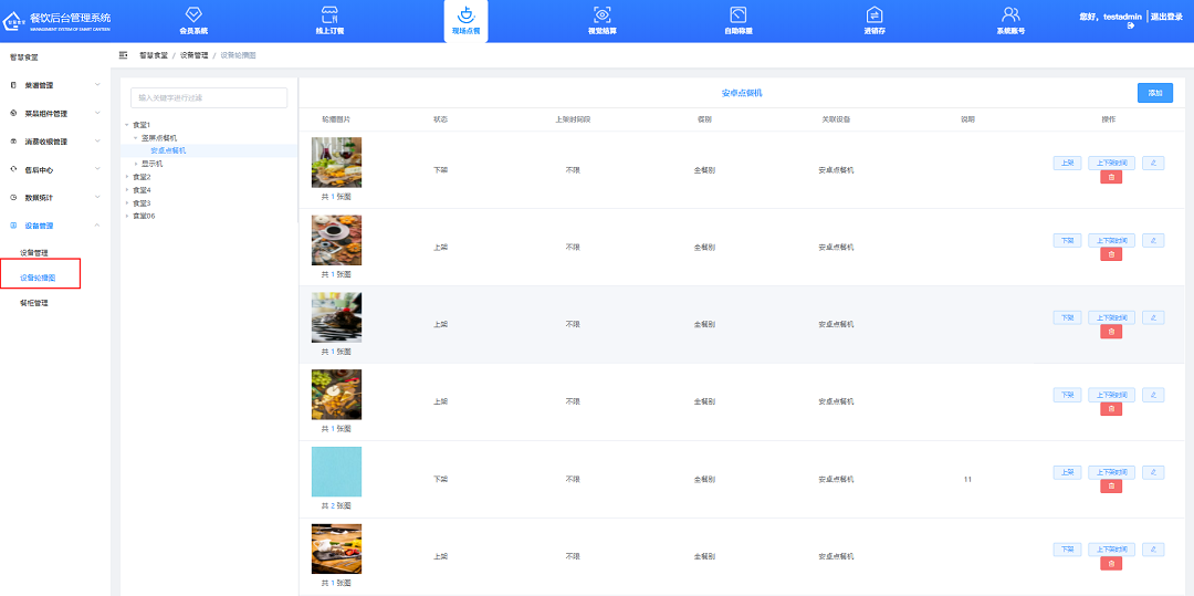 ①點(diǎn)擊“上架”或“下架”按鈕進(jìn)行上下架操作(上架即設(shè)備展示該輪播圖組,下架即隱藏),可設(shè)置上下架時(shí)間及可顯示餐別。