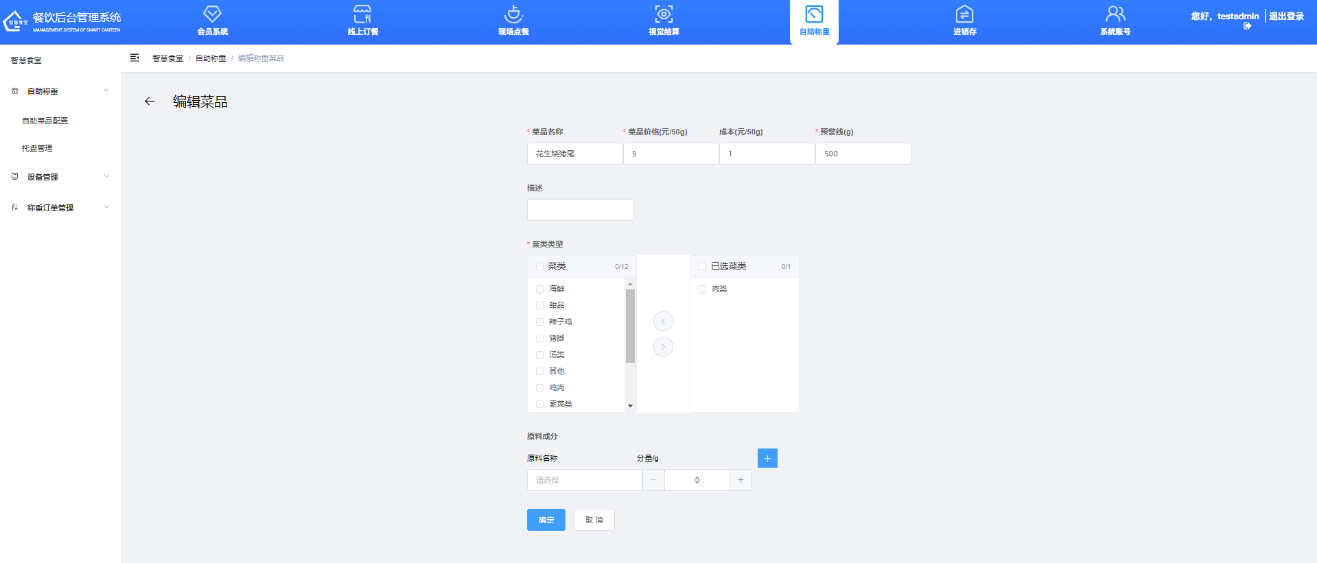 ②選擇計(jì)價(jià)方式,并輸入菜品名稱、菜品價(jià)格、菜品成本、預(yù)警線、描述等信息。③選擇菜品所屬的分類,選擇菜品搭配的配料。